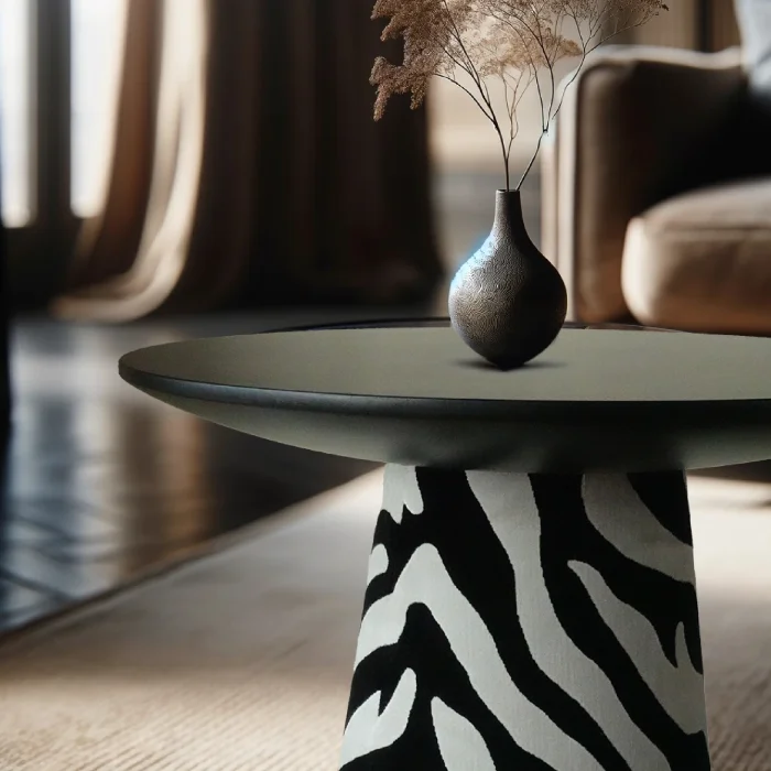 What sets this table apart is its wooden base, which is artfully upholstered in two different fabrics, each with its own color and texture. Starting from the top, the first section features a charming black and white zebra stripe pattern that adds a wild and artistic touch to the design. This visually striking pattern immediately catches the eye, creating a sense of intrigue.