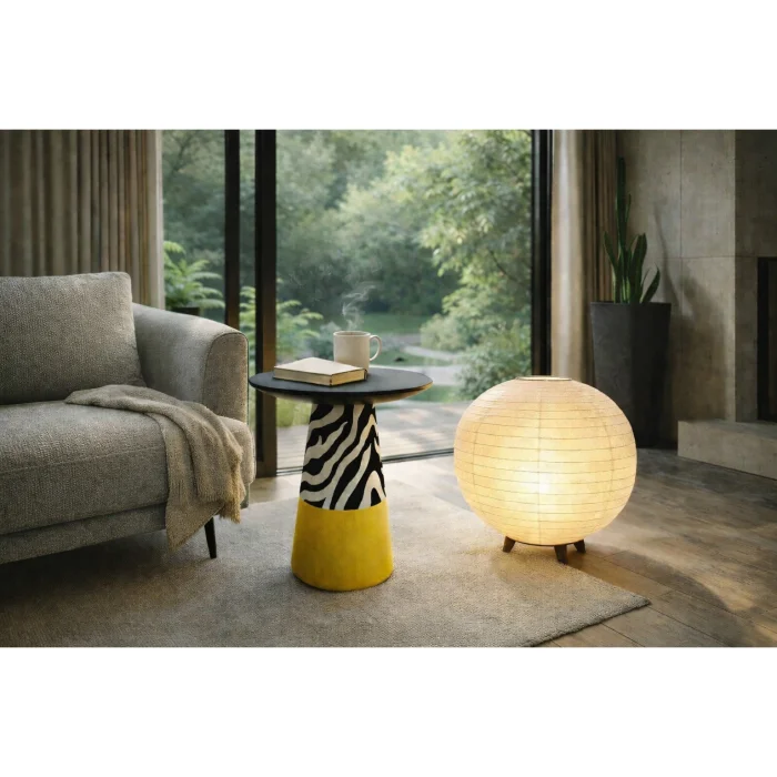 The velvet fabric underneath the zebra stripe pattern is a vibrant and cheerful yellow, injecting a pop of color and personality into the piece. This bold color choice creates a striking contrast against the matte black top table, making the table an instant conversation starter and a true statement piece.