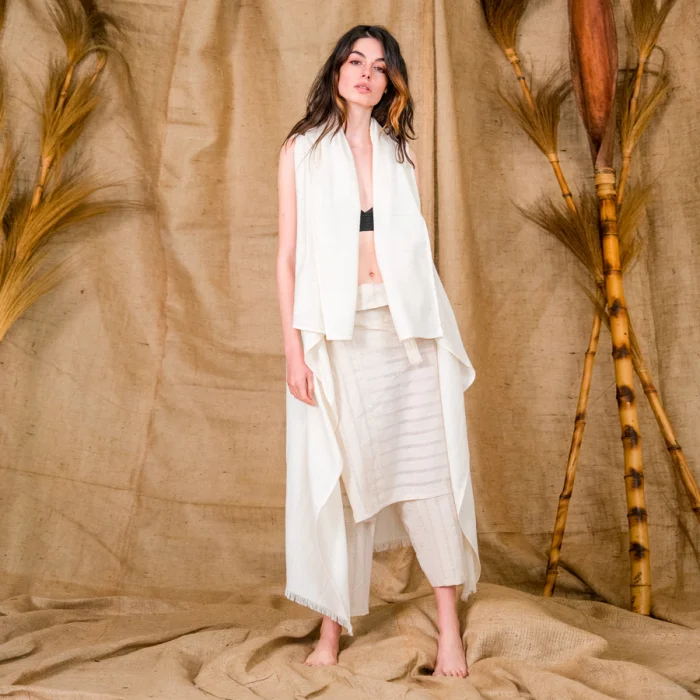 Linen Hera, the longline handwoven vest with frayed hem. The beautiful fabric draping around the neckline can be used a hood. Wear the statement vest from day to night.