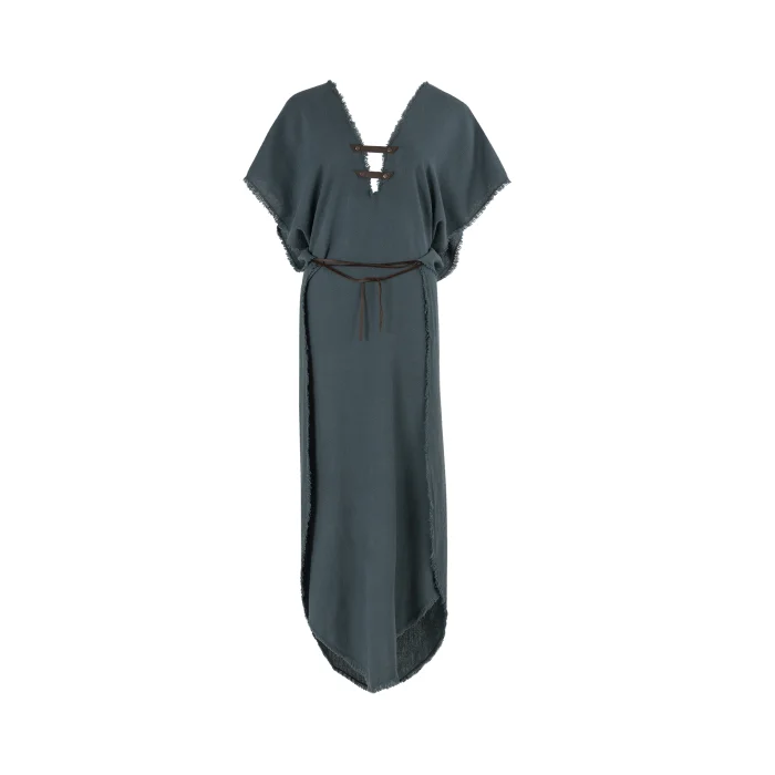 Long cotton genderless signature vest with multi-position belt closure and cowhide rope detailing with open slits on the sides. The asymmetrically cut hem breaks the flow, framing it. Leather strips on the front and back décolleté shape the loose fabric. Over time, the specially painted and handcrafted characters transform these pieces, with the colors fading and the leather becoming aged, adding to its uniqueness.