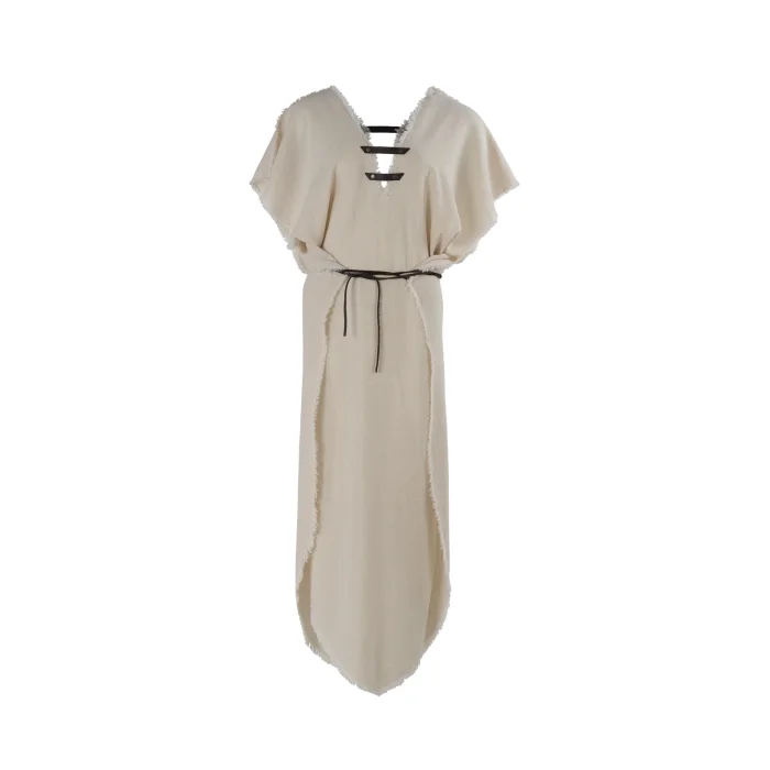 Long cotton genderless signature vest with multi-position belt closure and cowhide rope detailing with open slits on the sides. The asymmetrically cut hem breaks the flow, framing it. Leather strips on the front and back décolleté shape the loose fabric. Over time, the specially painted and handcrafted characters transform these pieces, with the colors fading and the leather becoming aged, adding to its uniqueness.