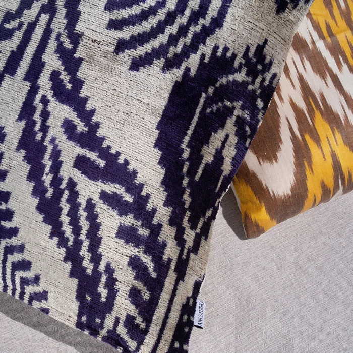 PRODUCT DETAILS & MAINTENANCE 100% silk. It is made of traditional woven ikat fabric. 50 cm x 50 cm DETAILS & MAINTENANCE Made in Turkey. Hand wash only. Do not throw it in the dryer.