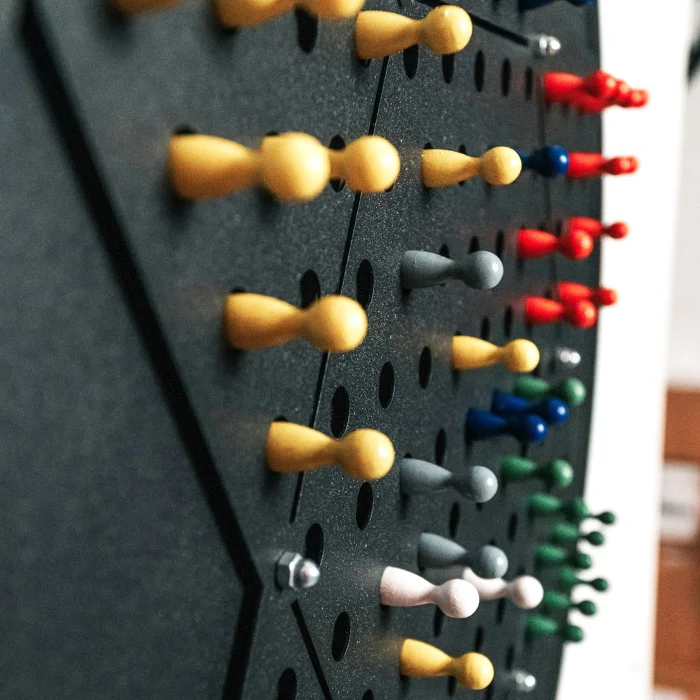 Each player chooses a set of 10 colored pegs.