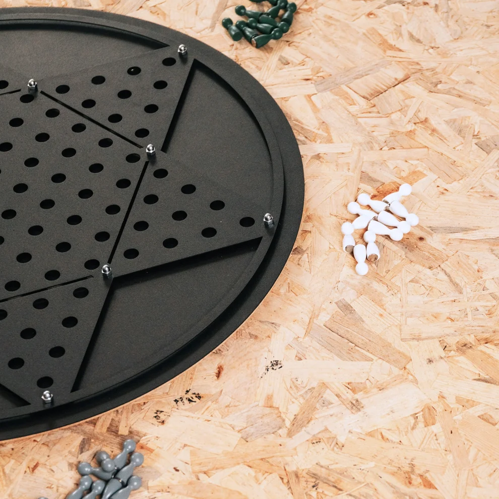 The player who successfully moves all of their pegs to the opposite triangle first wins the game.