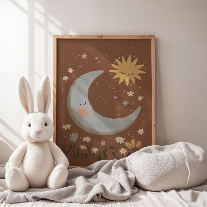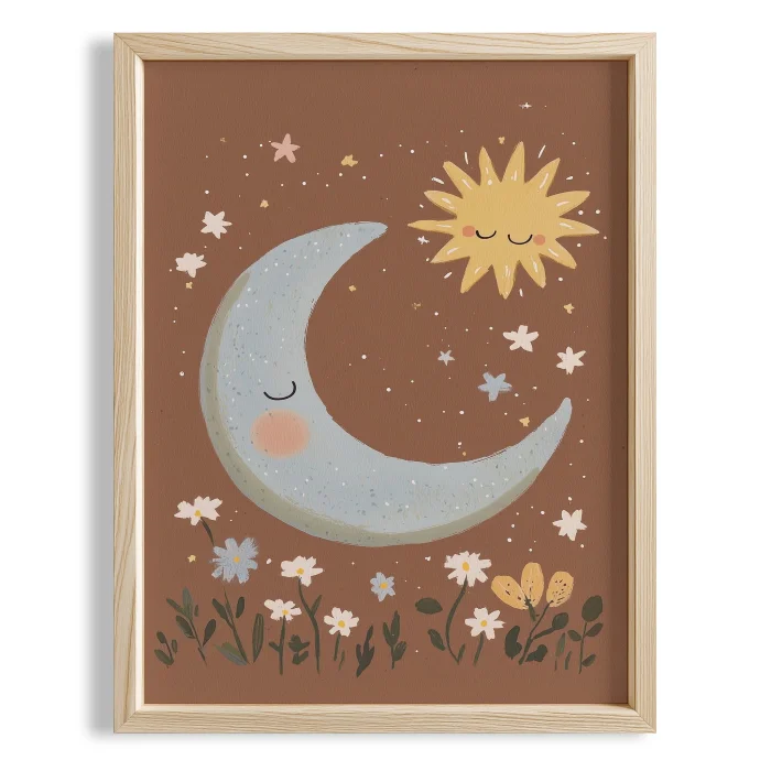 Product: Sleeping Moon And Sun Friendship Illustration Kids Room Wooden Wall Art