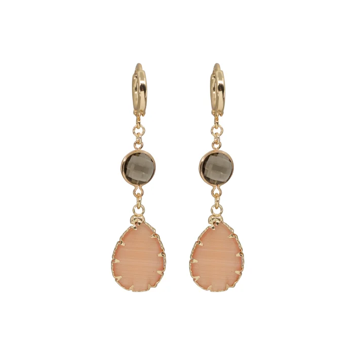 Drop earrings with bezel set round smokey quartz crystal and nude moon stone