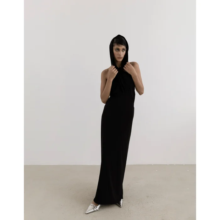 The form, which is defined by the back drawstring detail and the hat, creates a cross-bend detail on the front panel. ✓ Hat Detail ✓ Sleeveless ✓ Cross Collar ✓ Lined ✓ Jersey Fabric ✓ Length 59.06 inches