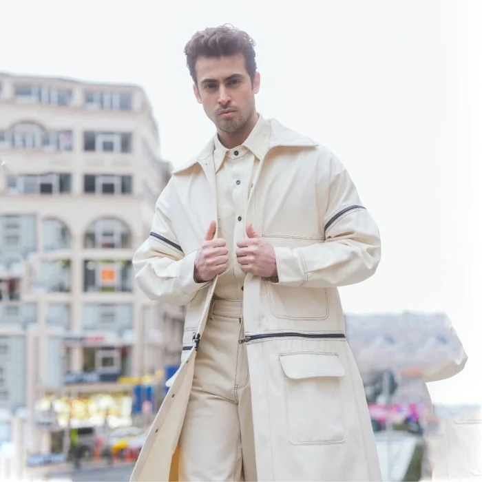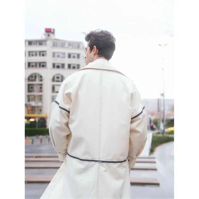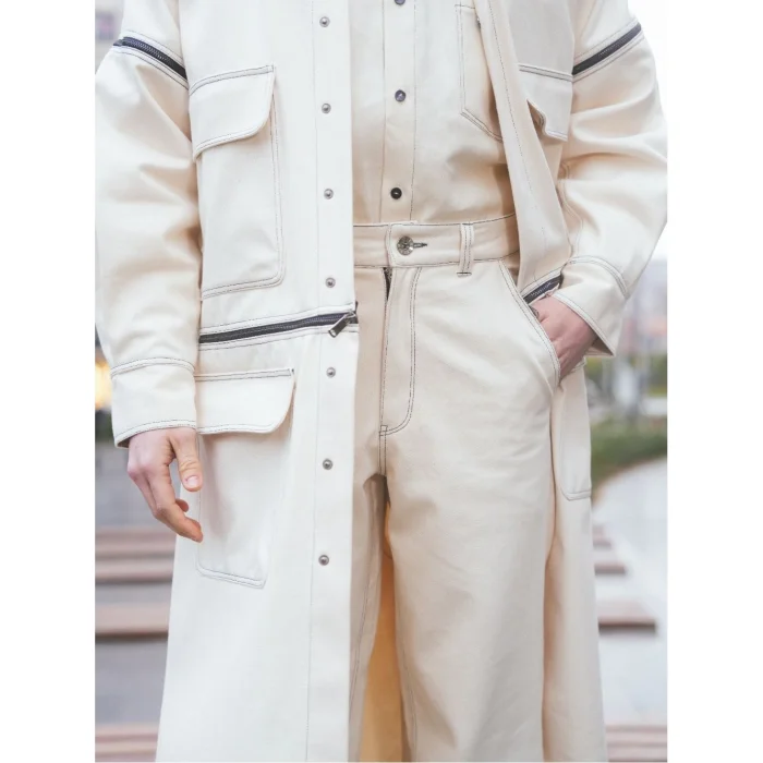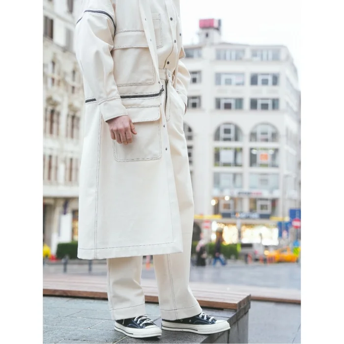 This convertible oversize jacket offers many style options. You can wear it with the sleeves for a classic look, remove the bottom for a modern touch, use it as a traditional jacket, or opt for a sleeveless long shirt.