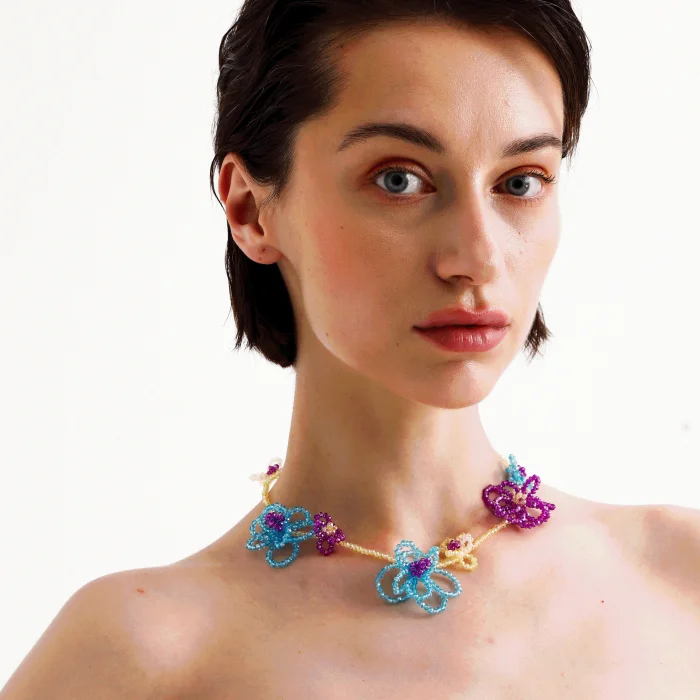 It is produced by knitting millimetric crystal beads with fishing line with a resistance capacity of 8+kg.