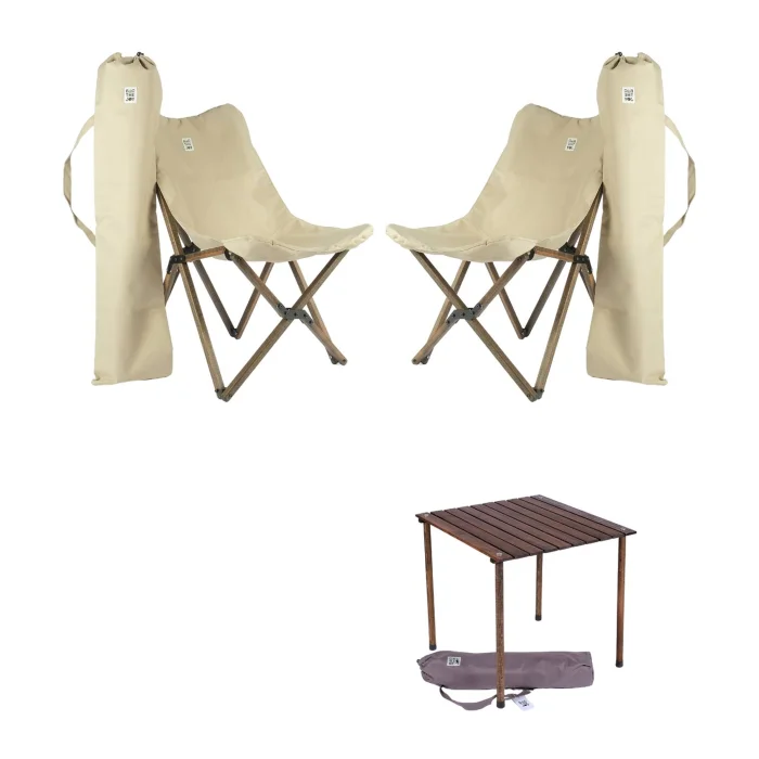 BAG THE JOY 50 * 50 * 50cm WOODEN ROLL FOLDING BROWN CAMPING & PICNIC TABLE + 2 BROWN WOODEN FOLDING CAMPING CHAIRS – BEIGE COVER