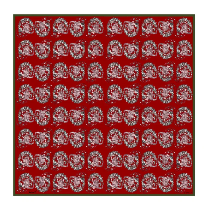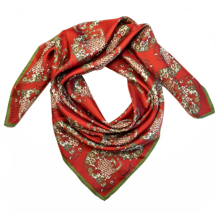 A sensational silk scarf with a red paisley pattern inspired by Persian carpets.