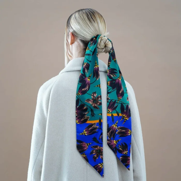 Made of pure soft silk this essential accessory is printed with a graphic floral print, playfully patterned against a vibrant colourful backdrop to lift any outfit. This versatile twilly scarf can be worn in many ways to adorn your look – twirled around your neck, at the waist or as a headband.