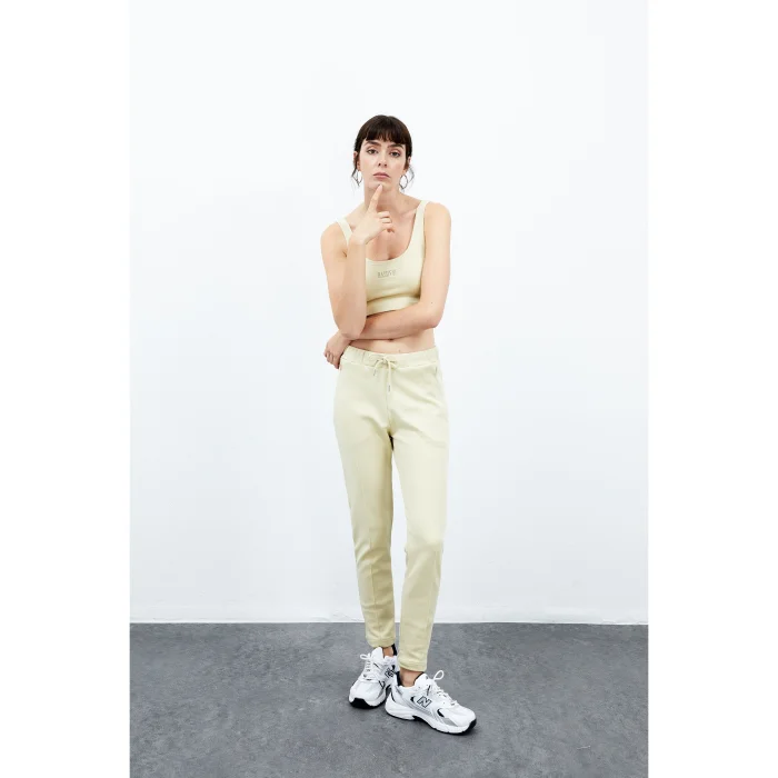 75% Cotton 25% Recycled Polyester. Classic cotton sweatpants of medium height. The waistband is laced at the front and has pockets on the side. The model wears Small with a height of 1.79 meters. You can choose your own size. BSGWFBESP01