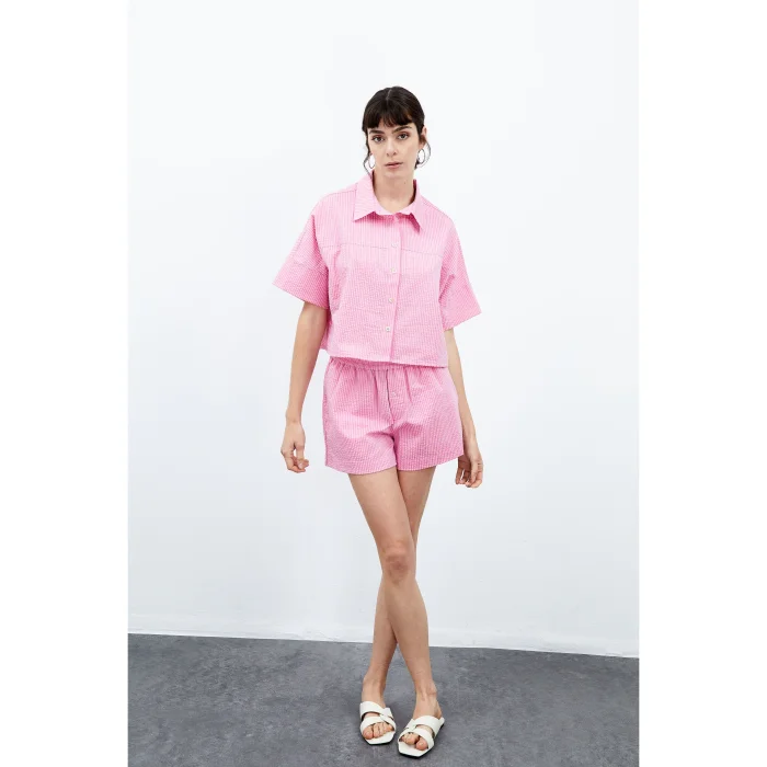 100% Cotton mid-height women's boxer shorts with waist. The waistband is elasticated, with side pockets and buttons on the front. The model wears a size Small with a height of 1.79 meters. You can choose your normal size. BSGWFBPJSH02
