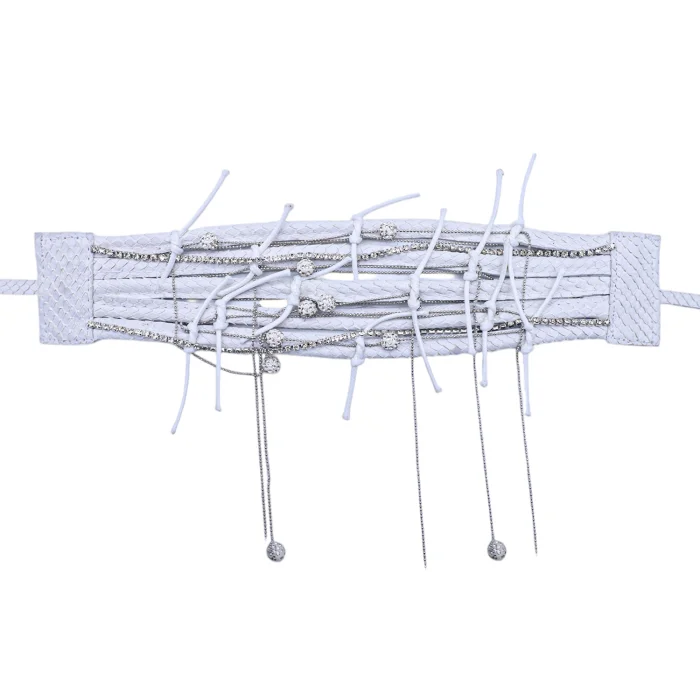 Genuine snake leather, brass chain, crystal stone, ball with marcacite