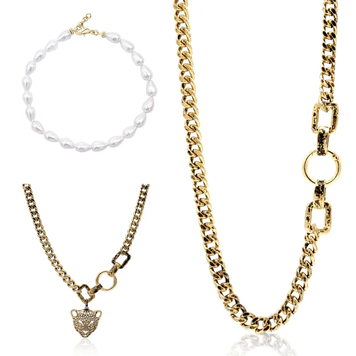 Production Type: Handmade Set Content: Magnifence set is combined with three different necklaces. Bianco Necklace, Tigre Gold Plated Tumbled Steel Chain Necklace, Ura Gold Plated Tumbled Steel Chain Necklace