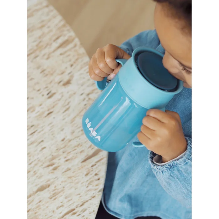 Lightweight and practical, the learning cup is ideal for children to learn to drink, just like the use of cups. 360° system: allows drinking from any side of the glass Simple lip pressure system: liquid flows only when the child presses his lips to the edge of the glass Anti-drip disc: prevents spillage of liquid Lightweight and unbreakable cup Removable handles: to fit every child Hygienic cover: to protect the watershed during transportation Easy to clean: The cup can be easily removed Recommended age of use: 12 months+ Capacity: 340 ml Maintenance: Hand washing or dishwasher washing on a sensitive schedule is recommended