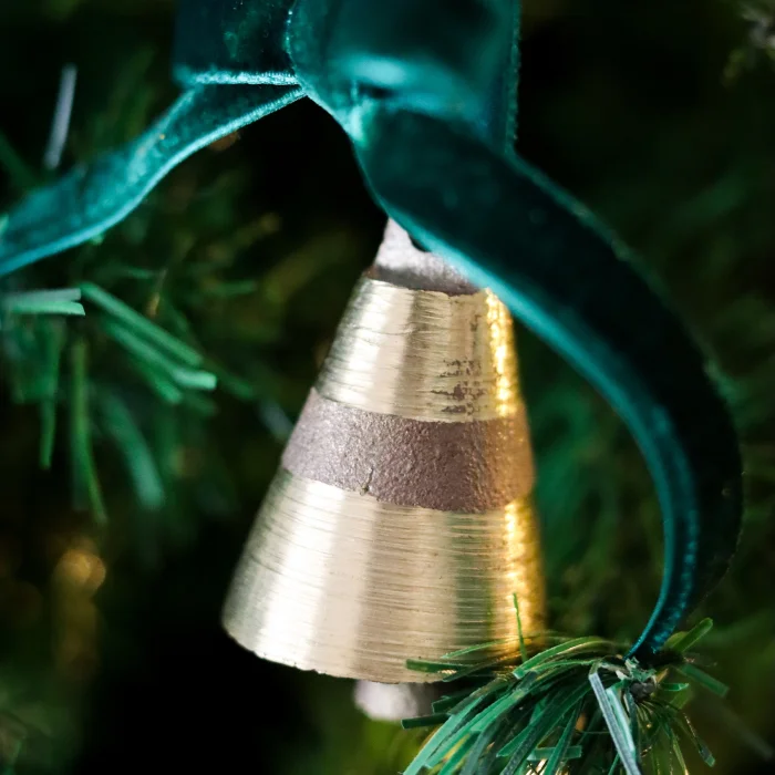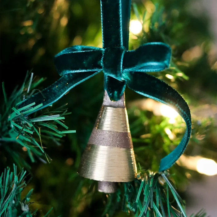 Decorate your tree in true traditional Christmas style with the Velvet Ribbon Medium Bell from the Beige & Stone Christmas collection. Dimensions:; Ribbon: 12 cm ; Gold bells: H: 5 cm ; It is made of velvet ribbon and brass bell.