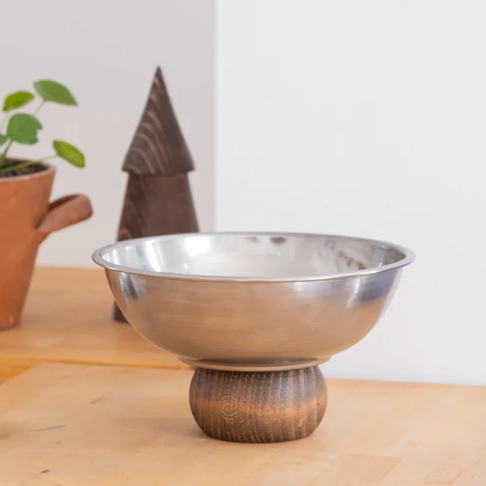 Metal 22 cm Presentation Bowl with Wooden Legs, where elegance and natural design meet, adds an aesthetic touch to your tables. The elegant design of the high-quality metal bowl, combined with the natural wood legs, offers a look that is both modern and rustic.