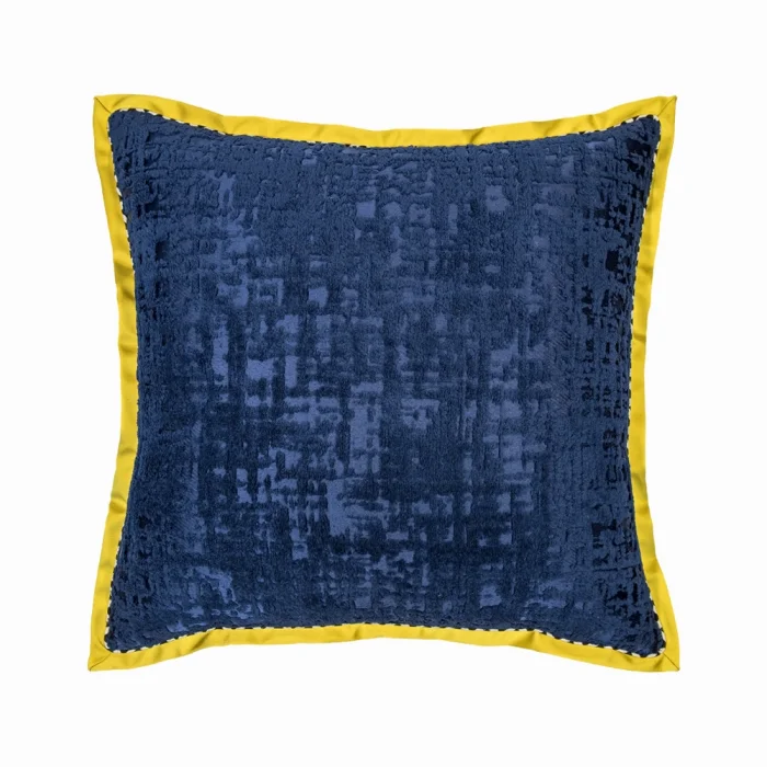 Square woven patterned velvet pillow with yellow edging.Back of the pillow is plain navy blue fabric
