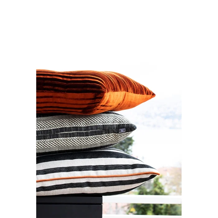 Square orange striped velvet buttoned pillow. Back of the pillow is the same as front.