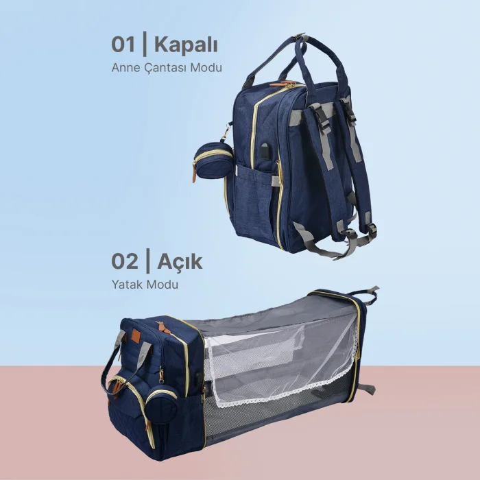 The bag transforms into a portable baby bed, providing an ideal space for your baby to sleep and play comfortably outside. The mosquito net, which prevents mosquitoes and insects from entering your baby's sleeping area, provides a safe sleep. There is also a change pad that offers a hygienic area where you can change your baby's diaper. This feature provides a very practical use when caring for babies outside.
