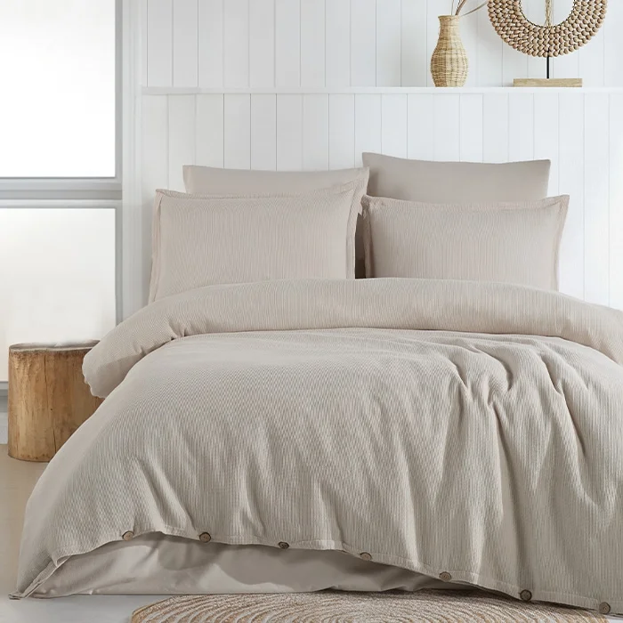 Aden mini waffle textured duvet cover set gives your bed a comfortable and inviting feeling with its softness and gentle texture, making it a comfortable option for sleeping. 75% Cotton 25% Modal STANDARD SIZE: Duvet cover/duvet cover 200x220cm Bed sheet 260x280cm Pillowcase pillowcase 50x70cm (2) Decorative pillow case (50x70 cm (2) QUEEN SIZE: Duvet cover 220x240cm Bed sheet 270x310cm Pillowcase pillowcase 50x70cm (2) Decorative pillow case (50x70 cm (2)