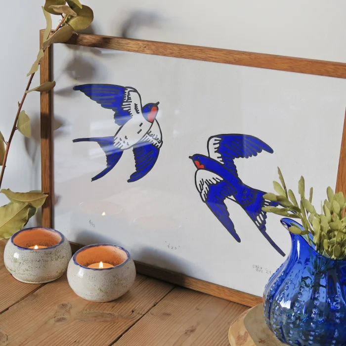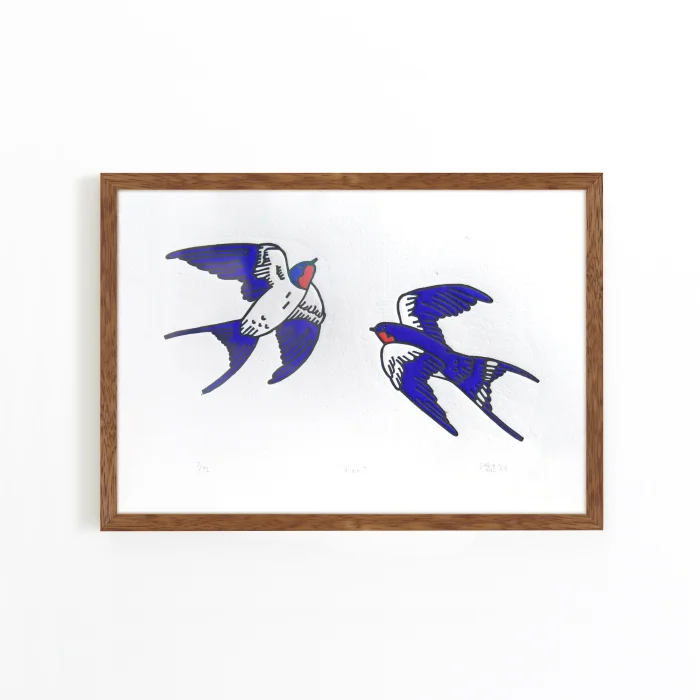 The frame is made of high-quality limba wood, which adds an elegant touch to the linocut print.