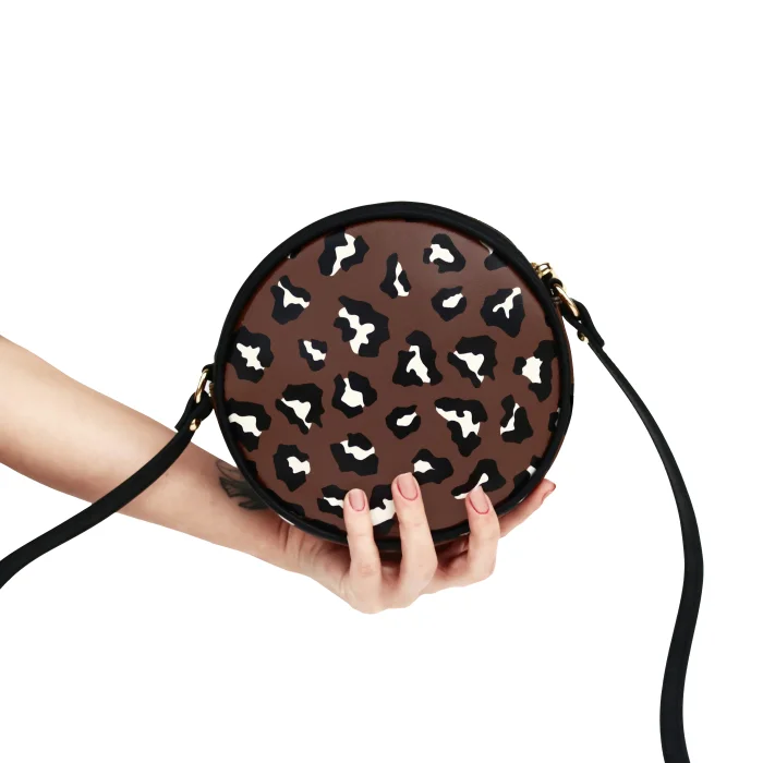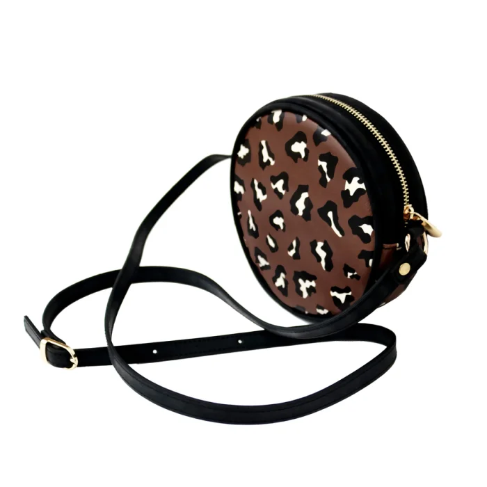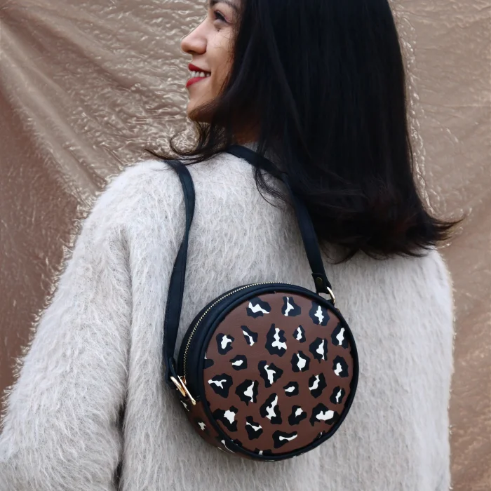 Round shaped crossbody bag in dark Brown Leopard print.