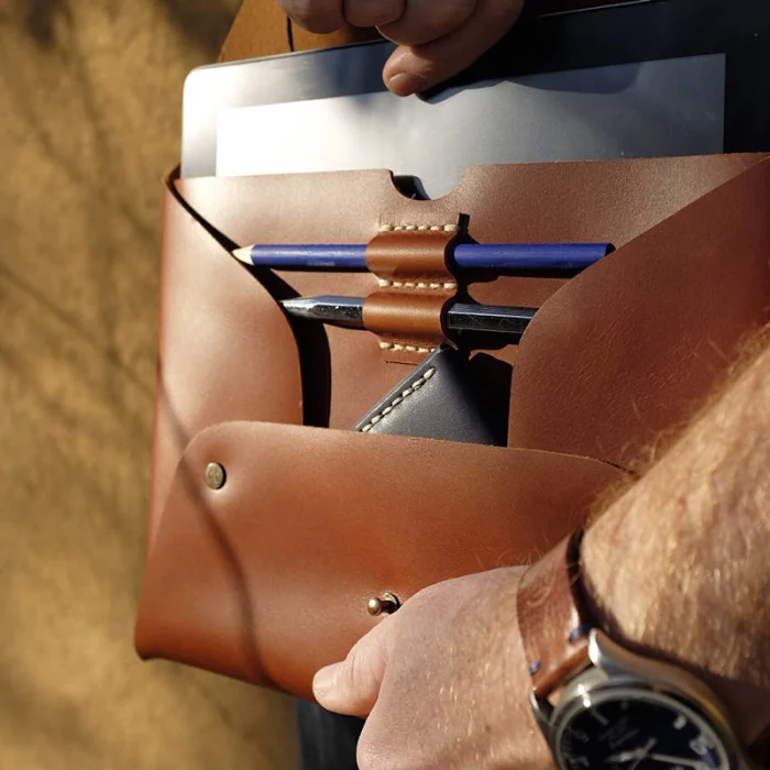 All pieces are cut from cowhide and are saddle-stiched with waxed thread by hand. Custom copper hardware has been used to improve the ease of usage and the durability of our products.