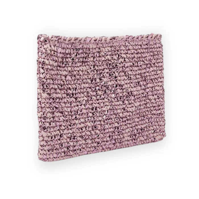 Hand-knitted clutch form bag with silvery raffia rope with tassel detailing.