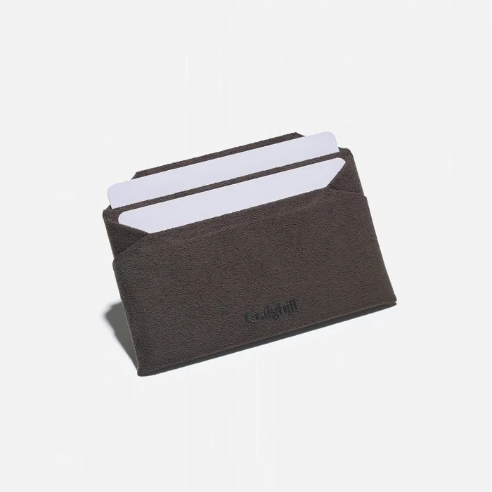 The Batten Card Wallet features a minimal design with maximum durability, created by folding two layers of Ultrasuede together and securing them with a single custom-cut Exoflex band. It includes three card pockets, each capable of holding at least two cards.