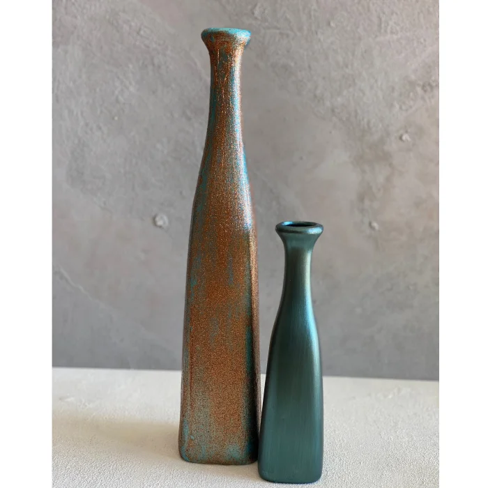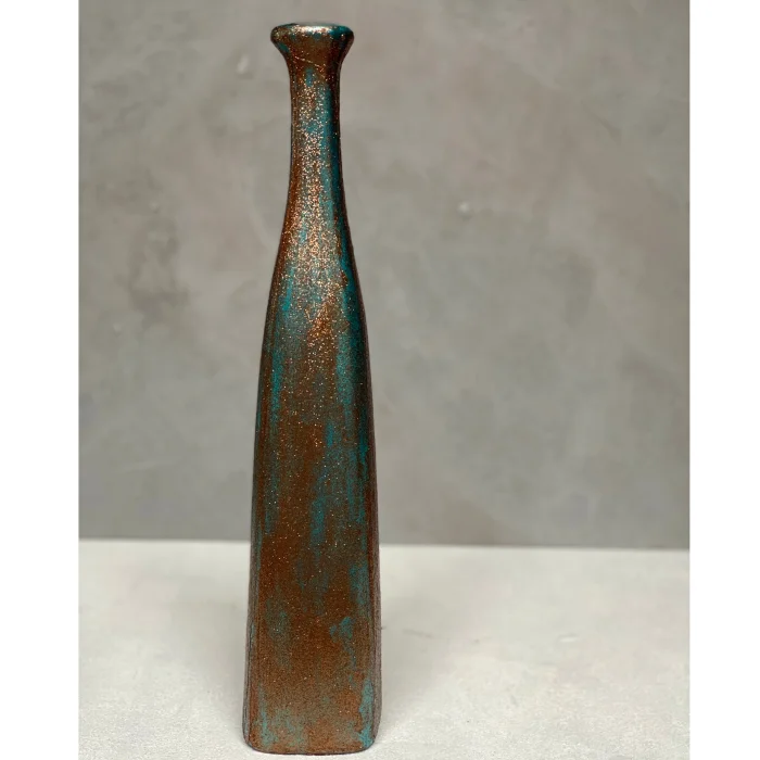Dea'rt Istanbul Harmony Series Ceramic Glitter Vase Harmony is the harmony of the elements that make up a whole with each other in aesthetic dimensions. The specially designed Harmony Series, bearing the signature of Dea'rt Istanbul Derya Kurdoğlu , has been designed with inspiration from the reflection of capturing the harmony of all these beauties, based on the search for an artistic beauty and perfection in human life. Ahenk Series Ceramic Glitter Bottle is the eye-catching pieces of this special series with its silvery design. It is harmonized with copper glitter on petroleum green and bronze color. You can provide an elegant detail in your living spaces, home and office decoration. Each product is hand-crafted by the designer. Discover this special work for both yourself and your loved ones and bring the magic of art to your home! Material: Ceramic. Size: 42x8 cm. Production: Handmade.