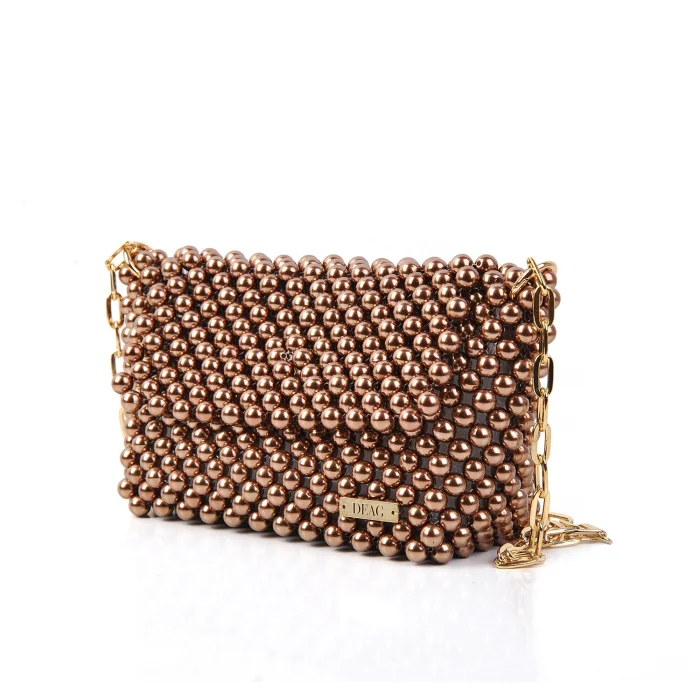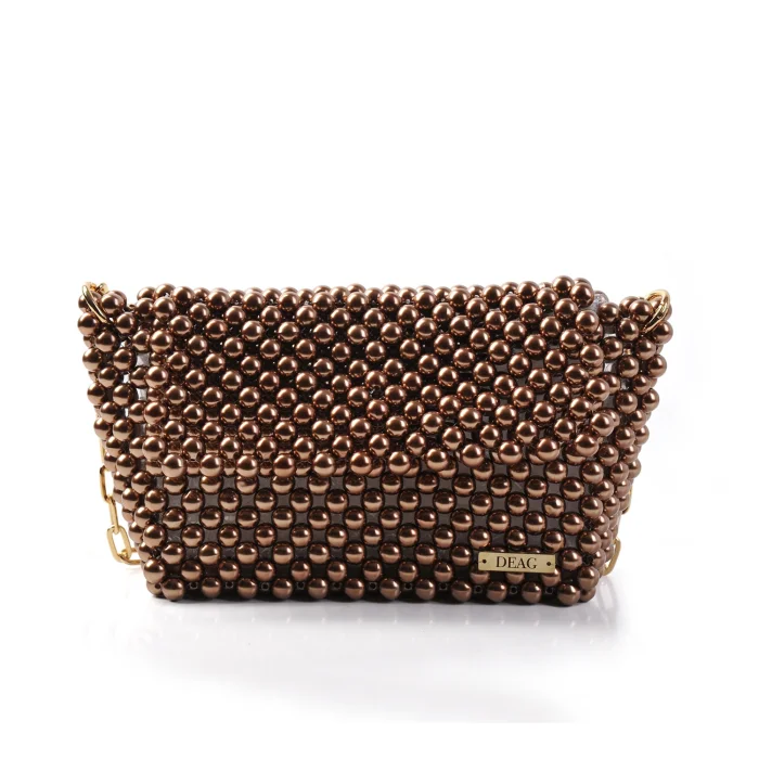 Handmade beaded handbag. Standing pearl beaded handbag Metal shoulder hanger chain Height x Width x Depth 21 x 15 x 9 cm Brown MARERIAL 100% acrylic LONG HANGER 100% iron