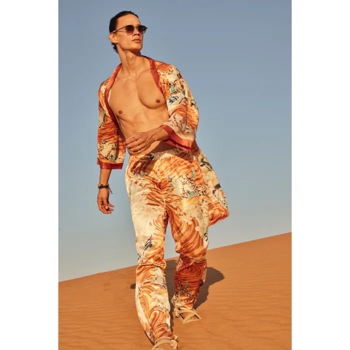 Kimono:-Oversized, -Silk-like texture, -Waist belt, -Wide flared sleeves, -Quick-drying, -Does not require ironing Pant:-Loose fit, -Silk-like texture, -Elastic waistband, -Wide legs, -Quick-drying, -Does not require ironing