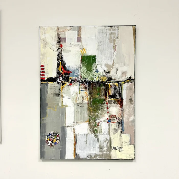 It is orderly, hard and controlled, like a city shaped by consciousness. The border passing through the middle makes the city skyline question the line between reality and reflection. Gray and white tones are the routine of life; The red and yellow accents that suddenly shine symbolize the striking moments in this routine. It is as if a memory suddenly comes to life: a voice, a smile, a disappearance...
