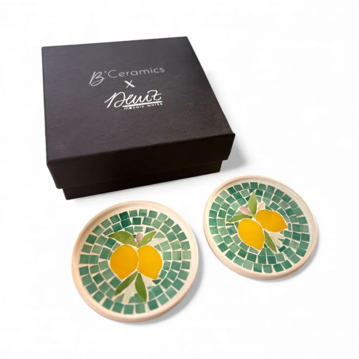 Lemon mosaic plate set, which we produce as 10 cm coasters or mini serving plates, are 3 mm glass flooring on ceramic. 100% HANDMADE