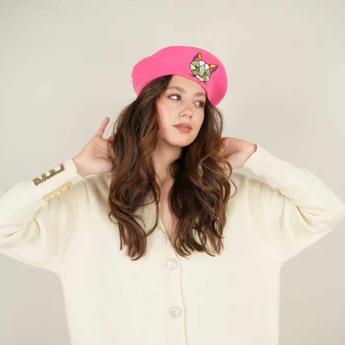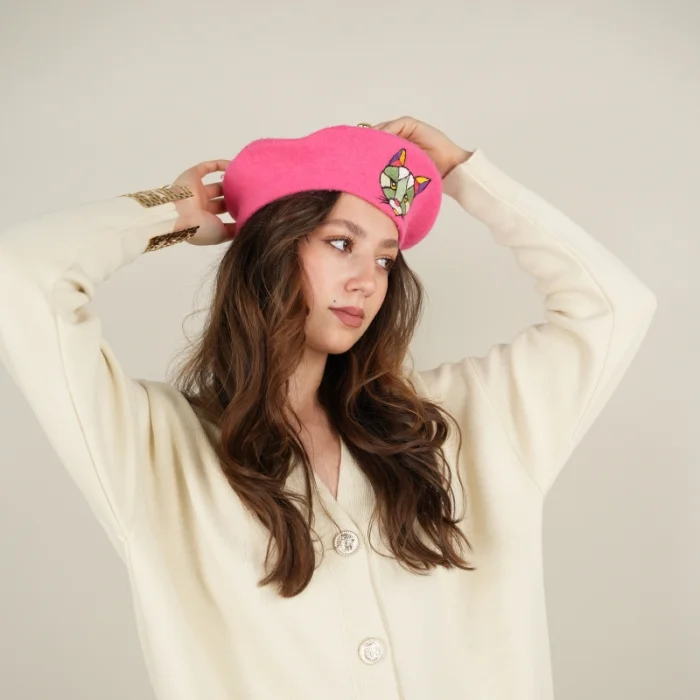 The candy pink graphic cat embroidered French beanie is the perfect accessory that combines cuteness and elegance. The beanie is made of a soft and comfortable felt fabric and stands out with the graphic cat pattern embroidered on it. The details of the cat in the style of drawing add a fun and modern touch to the berets. The candy pink color offers an ideal option for lovers of pastel shades, but it can also be easily combined with any style. Stylish and cute, this beanie reflects your style in cold weather while also keeping it warm and cozy. It can be a great gift option for those who admire cats.