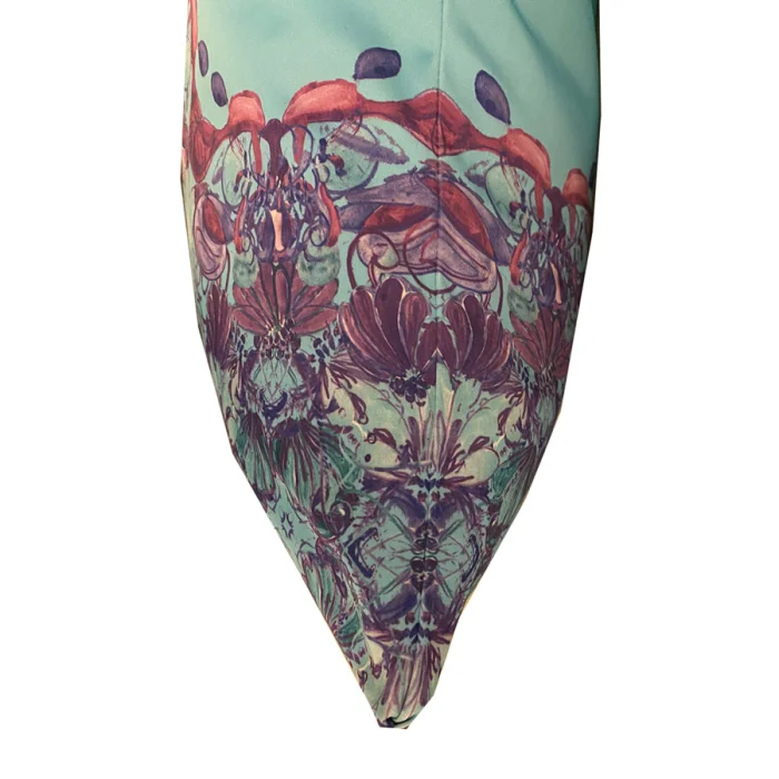 Contains polyester and elastane. Comes with feather padding. Fabric with back and front pattern.