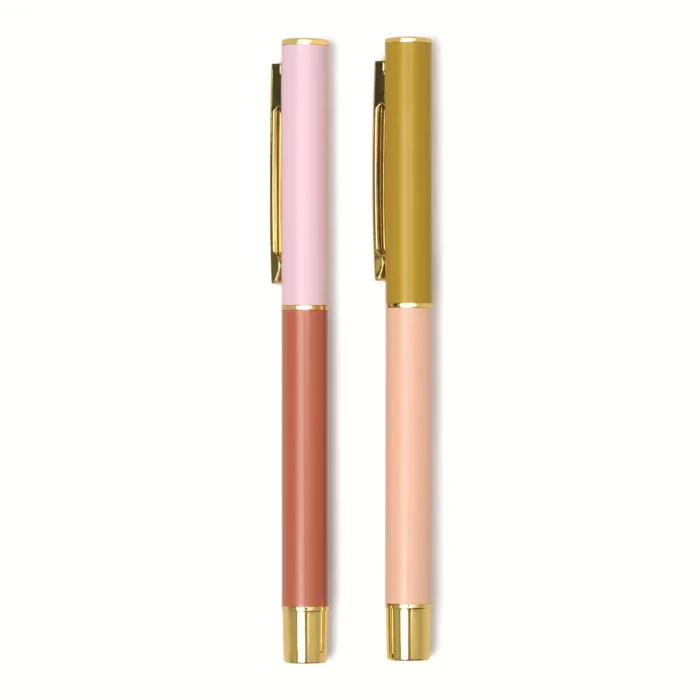 * Set of Two 13cm Round Metal Color Block Pens * Matte painted with gold accents * Black Ink Ballpoint Tip * Matching Gift Box
