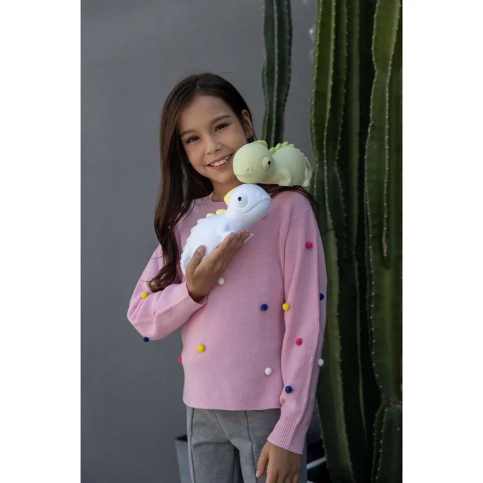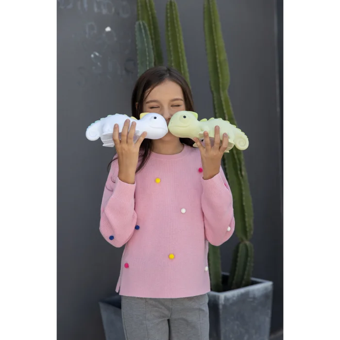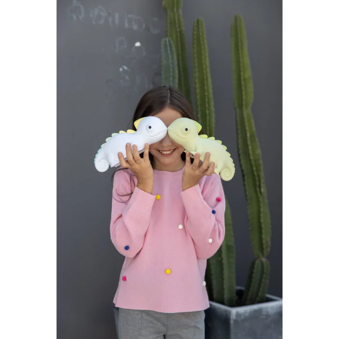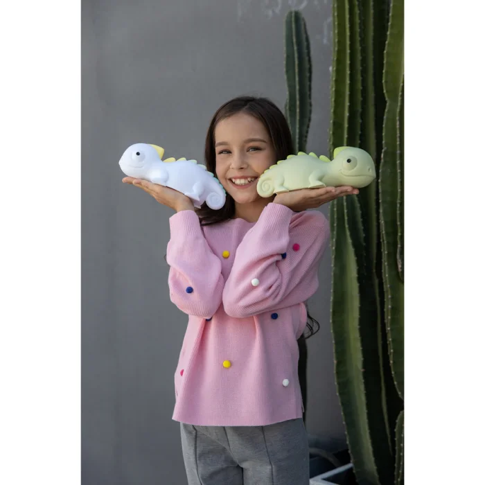 The Chameleon Lamp is powered by 3 AAA batteries (not included) and has 3 settings: on, timer function and off. When the timer function is turned on, the light will automatically go to sleep after 15 minutes. You can also change the color of the lamp with the special touch function!