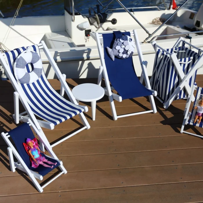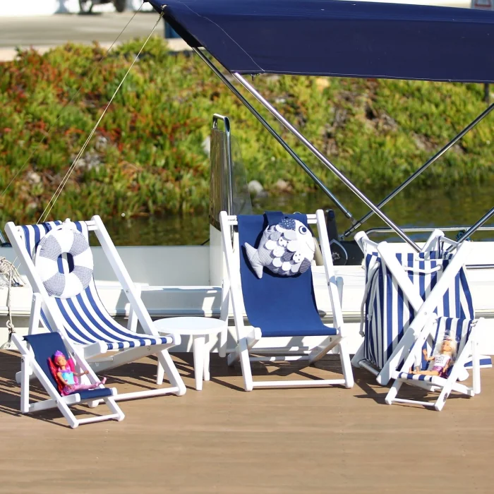 • Seat cushion, blue acrylic upholstery fabric suitable for indoor and outdoor use. The sale of the product includes one (1) blue cushion and one (1) wooden baby doll seat. The doll is used for décor purposes, the product is not included in our sale.