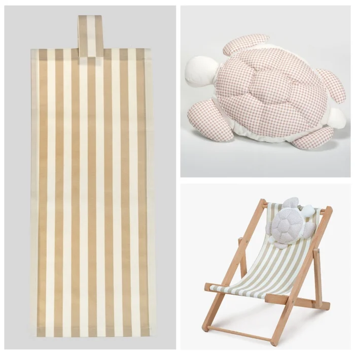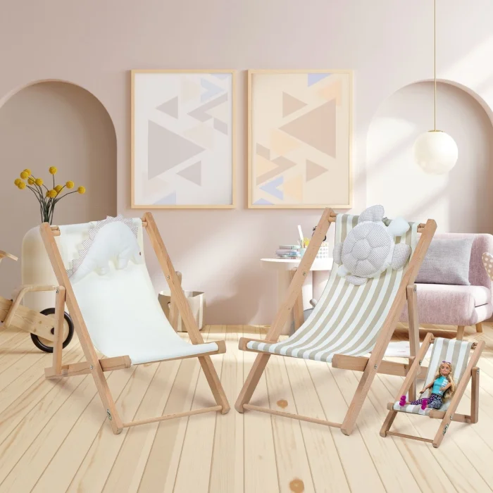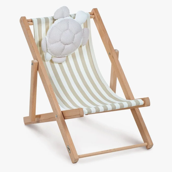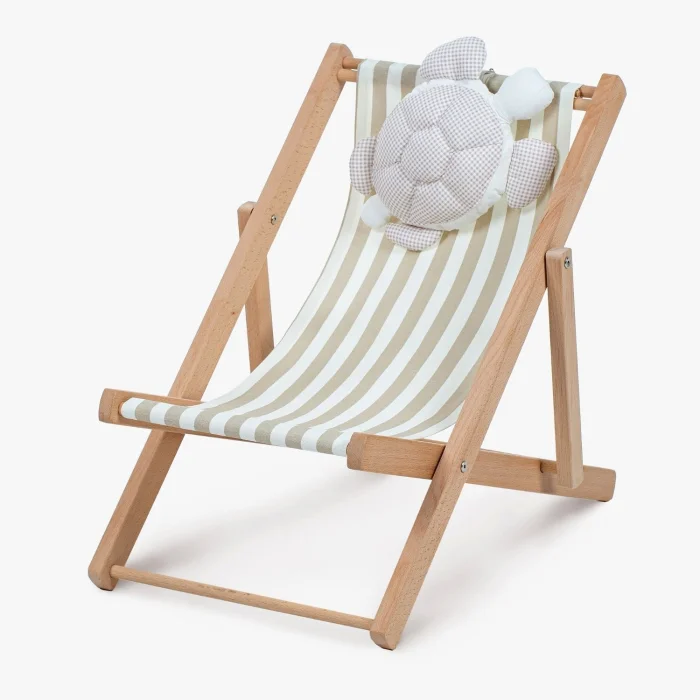 - Two-way solid wood fun natural children's lounge chair. Includes a champion Caretta Caretta pillow toy and a pink-and-white striped cushion.