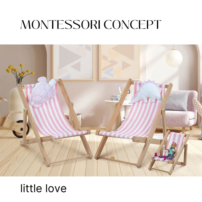 • Two-stage solid wood fun natural children's lounge chair. Includes a dino pillow toy and a pink-and-white striped cushion.