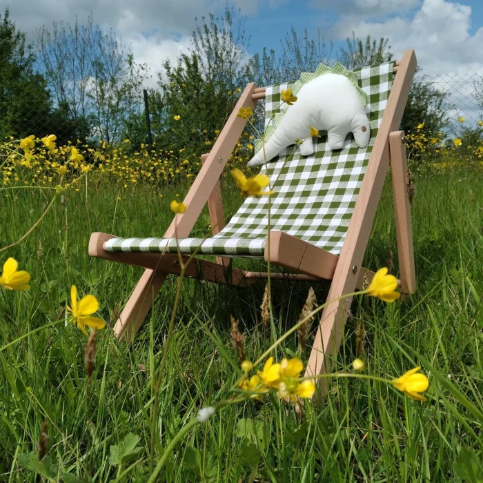 - Two-stage solid wood fun natural children's lounge chair. Includes a dino pillow toy and a pink-and-white striped cushion.