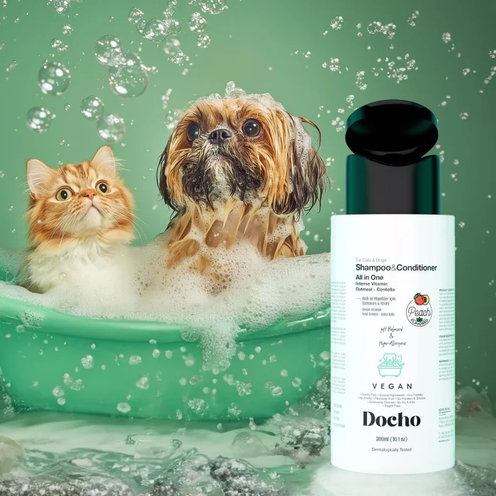 Make it easier for your furry friends to care for their furry friends! Developed with the All-in-One formula, this shampoo and conditioner both cleanses and nourishes hair in one step. Thanks to the rich content of vitamins, your pets' coat becomes healthy, shiny and strong. It gently cleans and softens hair with its formula containing water, glycerin, EDTA, betaine, oat extract, aloe vera, panthenol, Vitamin E, hydrogenated olive oil and sodium cocoyl isethionate. Aloe vera and panthenol deeply moisturize the hair and soothe the skin. Vitamin E and hydrogenated olive oil protect the hairs against external factors, giving them a natural shine. Oat extract, on the other hand, makes the hairs easier to comb. All-in-One shampoo and cream gentle on your pets' skin and coat; It nourishes the hairs with every wash and gives them a healthy appearance.• It nourishes and strengthens the hairs with its rich vitamin content.• It moisturizes and soothes the skin. • Protects hairs and provides natural shine.• Gently cleans hairs and makes combing easier. OatmealPromotes skin hydration and reduces irritation. It also nourishes and softens hair, provides a relaxing effect on the skinMoreAloe VeraIt maintains the moisture balance of the skin, relieves inflammation and helps the skin heal. It also softens the feathers. MoreGotu KolaPromotes skin healing and maintains the skin's youthful appearance. Strengthens feathersMoreCoconutNourishes, moisturizes and softens feathers. Supports the health of the skin. How Do We Use More? Thoroughly wet the hair of cats and dogs with water, then apply a sufficient amount of Docho All in One Shampoo & Cream by massaging the whole body. How Much?After waiting for 1-2 minutes, rinse with plenty of water. When? For best results, comb and style the hairs during the drying process. To which region? It can be applied to the whole body. Additional Tips? Comb the feathers during drying to maintain the moisture balance of the feathers and ensure easy combing. This helps the feathers look shinier and healthier. Frequently Asked QuestionsWhat is the Purpose of Docho Shampoo and Cream - All in One - Rich Vitamin 300 ML? Docho Shampoo and Cream - All in One - Rich in Vitamins is formulated in accordance with the breed and hair structure of cats and dogs. By maintaining the moisture balance of the skin and feathers, it helps the feathers to be easily combed, shaped and formed healthy, shiny feathers. In addition, it contributes to the strengthening of the physical barrier on the skin surface and the nourishment of irritated or impaired skin. It helps relieve skin reactions such as itching, allergies and skin rash. Docho Shampoo and Cream - All in One - How and How Often to Use Rich in Vitamins? The hair of cats and dogs is soaked with warm water so that there are no dry places. A sufficient amount of Docho All in One Shampoo and Cream is applied deeply, massaging the whole body. After waiting for 1-2 minutes, it is thoroughly rinsed with plenty of water. For best results, it is recommended to comb the hairs during the drying process.
