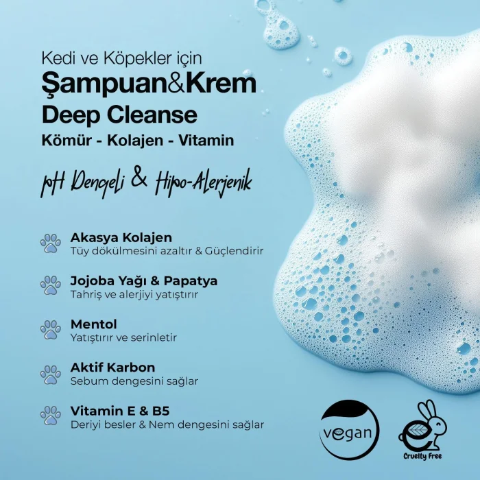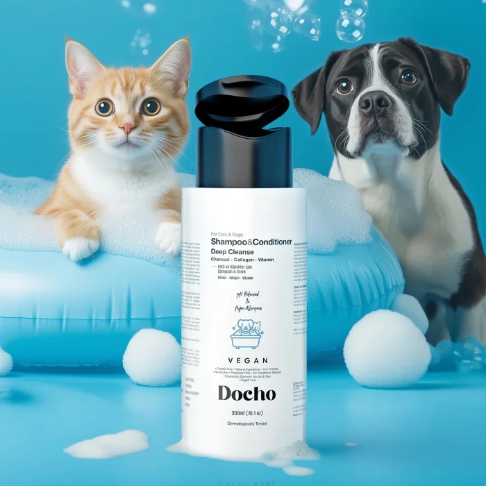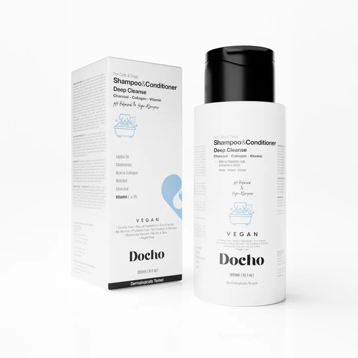 Thanks to the Activated Carbon in its Deep Cleanse composition, it helps to maintain the sebum balance in the skin structure and provides deep cleaning. With Acacia Seyal Gum Extract, known as Vegan Collagen, in its formula, it contributes to the formation of healthy and shiny hair by stimulating the hair follicles and follicles, helping to reduce hair loss. With the Chamomile and Jojoba oil it contains, it helps to reduce irritation, allergies and crusting and redness on the skin. With Menthol in its composition, it has a soothing, cooling effect, and helps in the treatment as an anti-itch. Thanks to the Vitamin E & Vitamin B5 in its composition, it supports the increase of the moisture balance of the skin and hair structure, while helping to nourish, repair and strengthen the irritated and/or damaged skin. Thanks to its rich and intense herbal content in its composition, it helps the hairs to be easily combed and shaped, while thanks to the vitamins it contains, it nourishes the skin, accelerates cell renewal, and ensures that the skin and feathers have a healthy appearance.• Provides deep cleaning.• Prevents and purifies fleas, ticks and pests.• Strengthens the hairs and reduces their shedding.• Brightens the hairs, increases skin elasticity. CollagenIt is a type of protein that increases skin elasticity and helps keep hairs strong and healthyIt also maintains the moisture balance of the skin and reduces the signs of agingMoreCharProvides deep cleansing of the skin, attracts toxins and impurities, supports the hair to look healthy and shinyMoreVitaminsEssential nutrients necessary for skin and coat health. Vitamins maintain the moisture balance of the skin and contribute to the nutrition of the hair. MoreJojoba OilNot only restores the moisture balance of the skin, but also nourishes and brightens the hairs, also softens dry areas on the skinMoreChamomileHelps soothe the skin and reduces itching and irritationProvides a relaxing effect, especially for sensitive skinMoreAcacia CollagenSupports the healthy appearance of feathers and skin, increases the strengthening and elasticity of hairs. MoreVitamin E & B5Maintains the moisture balance of the skin and improves the health of the hairs It supports, also helps to repair the skin. How Do We Use More? The hair of cats and dogs is moistened with water, then a sufficient amount of Docho Deep Cleanse Shampoo & Cream is applied by massaging the whole body. How Much?After waiting for 1-2 minutes, rinse with plenty of water. When? For best results, style the hairs by combing them while drying. To which region? It can be applied to the whole body. Additional Tips? By combing the hairs during drying, you can make them look brighter and healthier. Frequently Asked QuestionsWhat is the purpose of Docho Shampoo & Cream - Deep Cleanse - Charcoal & Collagen & Vitamin? Docho Shampoo and Cream is an effective product for cats and dogs that can be used on all breeds and coat structures. It is also effective in removing fleas and ticks. While it helps to maintain the sebum balance in the skin structure, it provides deep cleaning. It helps reduce hair loss by stimulating hair follicles and follicles and contributes to the formation of healthy, shiny hair. In addition, it strengthens the physical barrier on the skin surface and supports the nourishment of irritated or compromised skin. It helps relieve skin reactions such as itching, redness, crusting, allergies and skin rashes. What is the usage and dosage of Docho Shampoo & Cream - Deep Cleansing - Deep Cleanse - Charcoal & Collagen & Vitamin? It is applied deeply by wetting the hair of cats and dogs with warm water so that there is no dry place, and massaging the whole body with a sufficient amount of docho deep cleanse shampoo & cream. After waiting for 1-2 minutes, it is thoroughly rinsed with plenty of water. For best results, it is recommended to comb the hairs during the drying process. Does Docho Shampoo & Cream produce any change in coat color in white-haired dogs due to the charcoal content? While Docho Shampoo & Cream provides deep cleansing for dogs with white or cream-colored coats, it does not affect coat color at all.