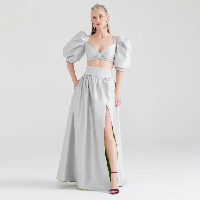 It can be paired with puff-sleeve bustier options in black, grey, or red.