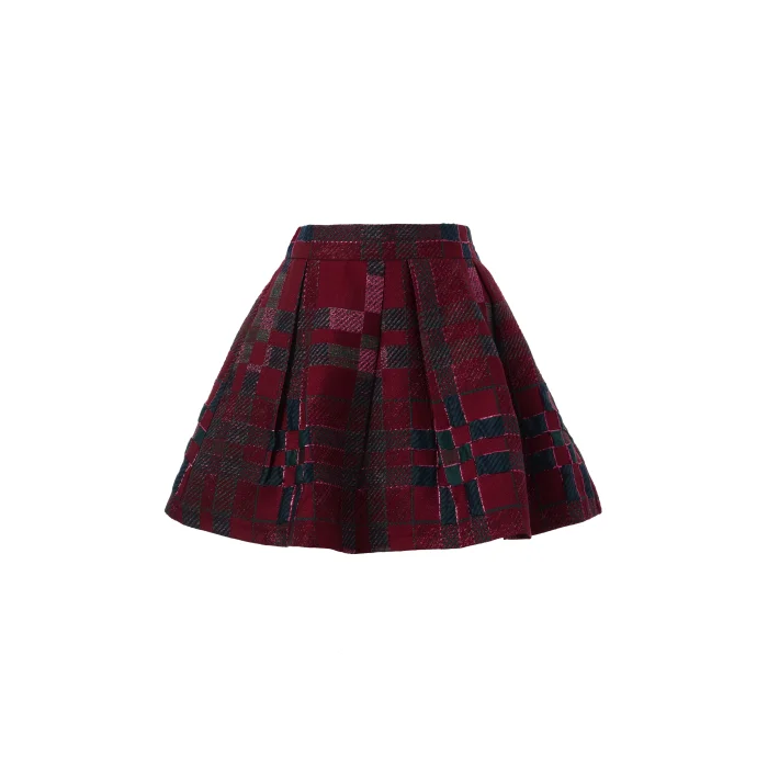 The plaid jacquard brocade fabric, which is enlivened with silvery yarn details, meets the original pleat cut and bell form. REBEL Mini Skirt; Dynamic and intriguing with different pleat details on the front and back, practical with pockets, stylish with color transitions.