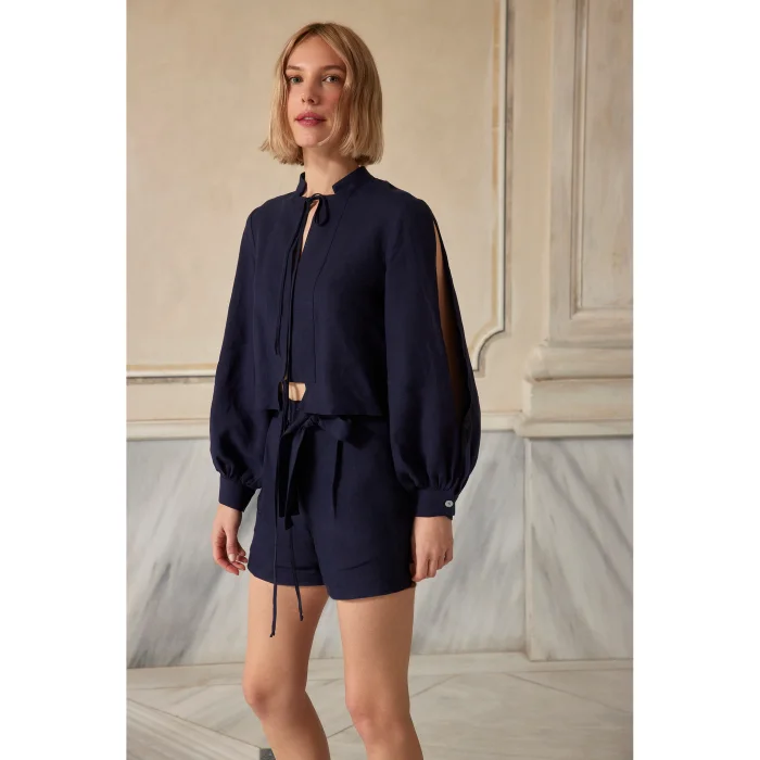 Mandarin collar tie-front shirt, arm slits, 100% Belgian Linen, Model Size: S - Height:176 cm, Bust: 81 cm, Waist:64 cm, Hips: 89 cm